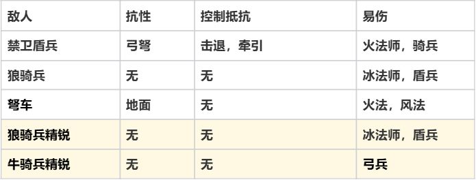 本关需要尽快清理掉狼骑兵的免伤次数,否则弩车堆积起来很难过关,只要有快速清理的手段,狼骑兵的血量并不高,就很容易通关了。