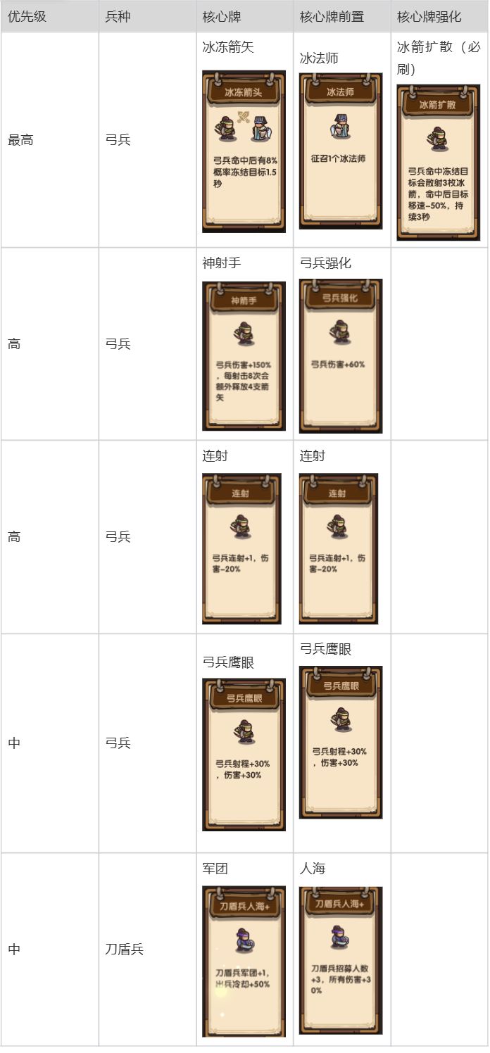 优先选满兵种:弓兵>冰法>风法>盾兵