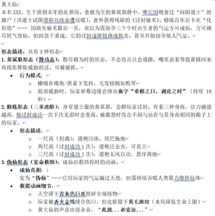 本名XXX,生于清朝末年的乱葬岗。食腐为生的黄鼠狼群中,唯它因啃食过“问阴道士”的腐尸(该道士试图借阴兵续命遭反噬),意外获得残缺的《讨封秘术》。修炼百年后卡在“化形劫”—— 因缺失秘术最后一页,误以为需掠夺三个午时出生者的气运方可成仙,方可褪尽妖气登仙。但因急于求成,它的讨封逐渐扭曲成执念,甚至开始掠夺他人气运。