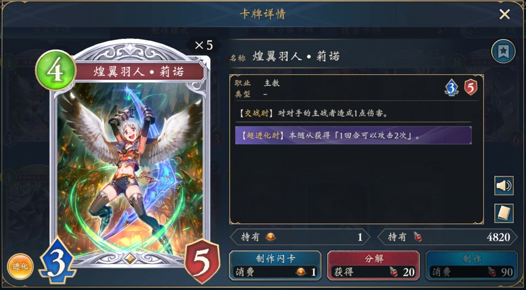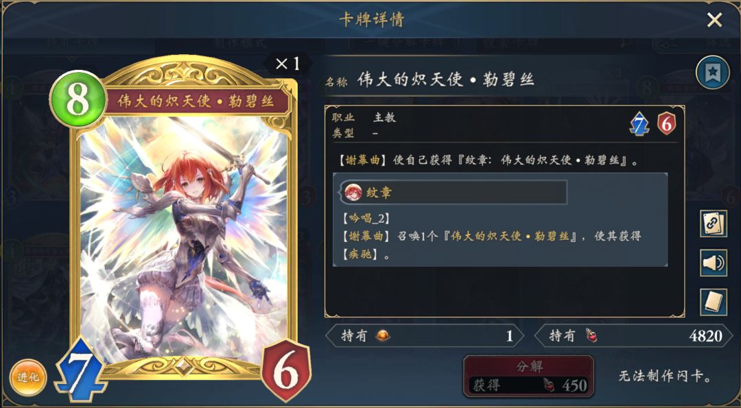 - 为了增加牌组厚度和对抗巫师的胜率,在综合考虑后我选择带一张天使,这张卡在实战中很难准时拍出,一般8费这个回合都在争夺场面或者扩大优势,如果使用进化点给一个需要后续回合才可能产生收益的卡会存在风险,但天使单卡质量绝对可以保证,其是你对战巫师或是主教内战中必不可少的胜利组件。