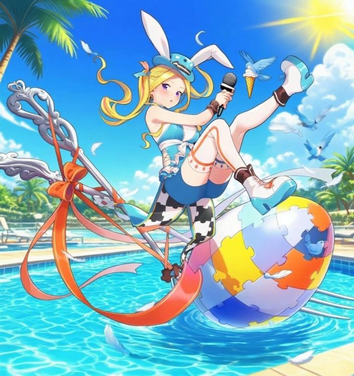 左手甜筒🍦 右手麦克风🎤 仿佛下一秒就要开启泳池边的欢乐演唱会~骑在彩色拼图球上,羽毛、飞鸟环绕,梦幻又灵动,像从童话里游出来的元气少女💖