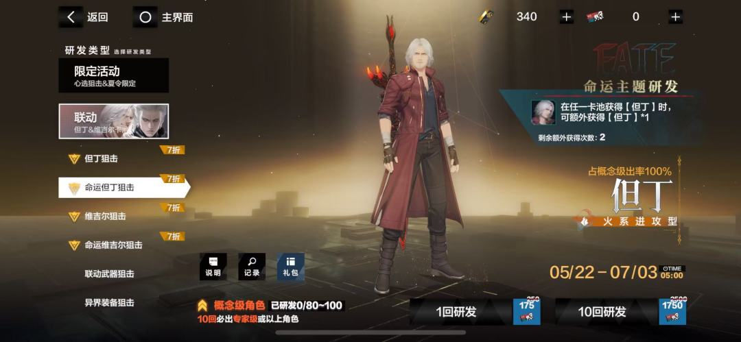 2、卡池抽取:在 “但丁狙击” 和 “命运但丁狙击” 联动卡池中抽取。但丁的获取概率会随着抽取次数增加而提升。并且,在 “但丁狙击” 和 “命运但丁狙击” 这两组研发池中,每组研发池前两次获得但丁时,可在研发界面领取相同角色。例如,在 “但丁狙击” 研发池或者 “命运但丁狙击” 研发池中共抽取出 1 次但丁,则最终总共可以获得 2 个但丁;若共抽取出 2 次但丁,则最终总共可以获得 4 个但丁;若共抽取出 3 次但丁,则最终总共可以获得 5 个但丁。