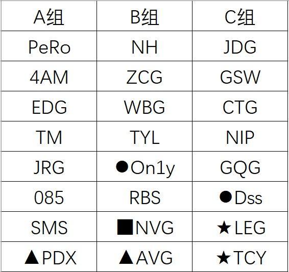 第一轮分组情况:(■表购买名额新晋PCL队伍(NVG疑购买的QY名额,而QY成员注入到RBS中),★表PCLP晋级队伍,▲表递补战队,⚫表此前传出队伍运营困难或者欲退出PCL队伍(此次EWC预选可能就是临时凑四个人随便打打))