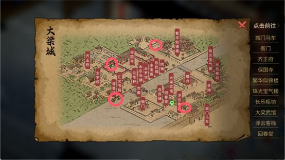 【在大梁城中发生过命案的地方寻找线索。发生过命案的地方有:保国寺内的大钟;繁华似锦楼外的小路;河道下游的码头;城门口第一家朱文的私宅。】