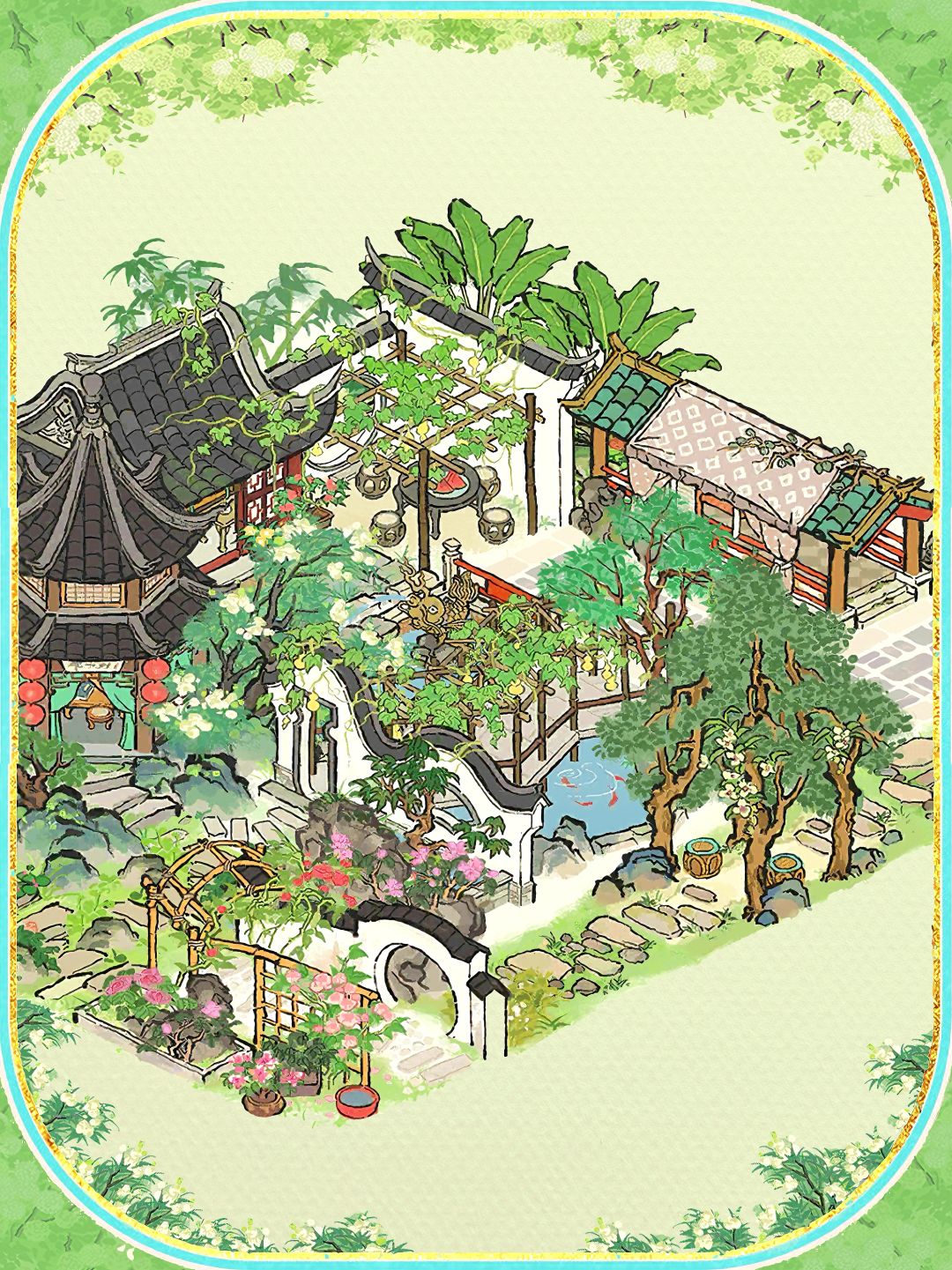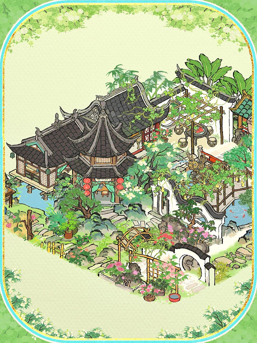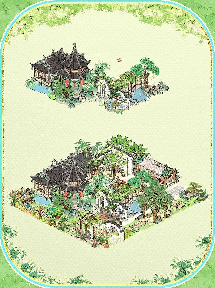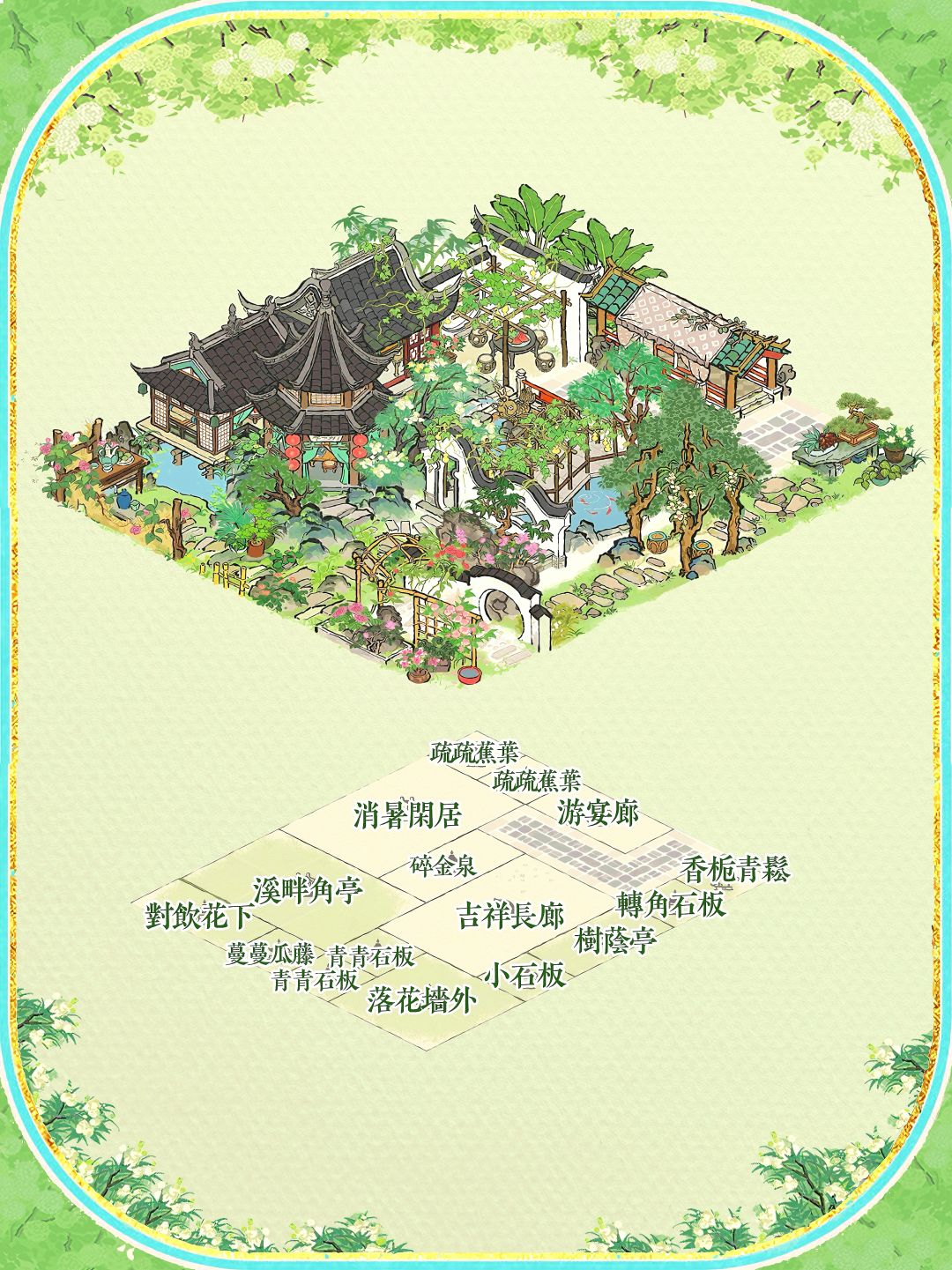 建筑:溪畔角亭,吉祥长廊,消暑闲居,落花墙外,对饮花下,树荫亭,转角石板,香栀青松,小石板,青青石板