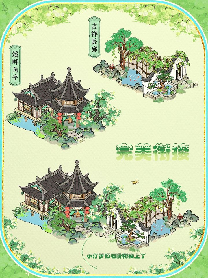 溪畔角亭+吉祥长廊,小汀步完美衔接上了