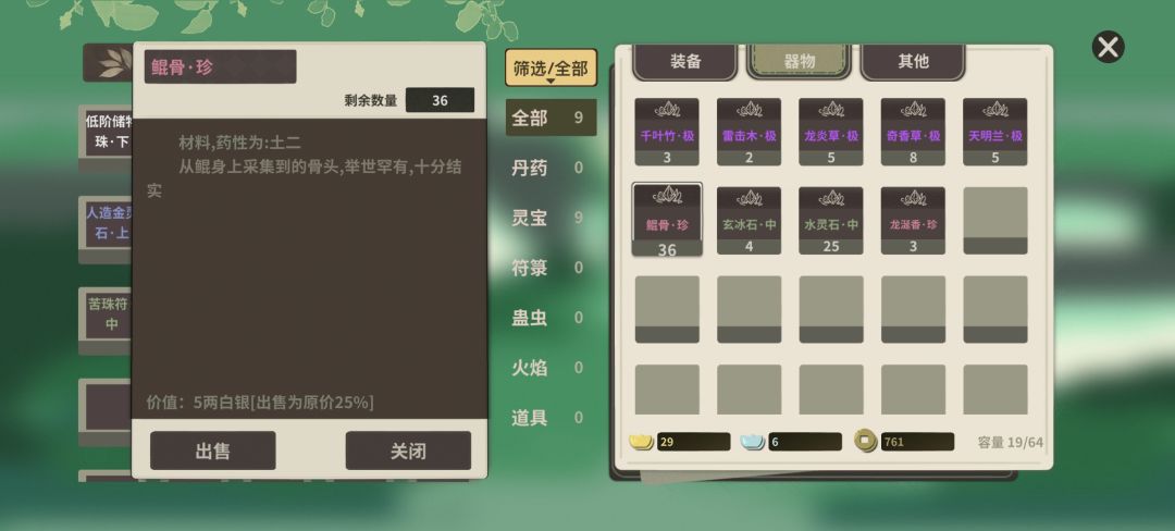 建议:唯一真神,直卖值钱,不用调查,神机巨械缺修复材料可以打,水灵宝还是要拍卖行买啊。