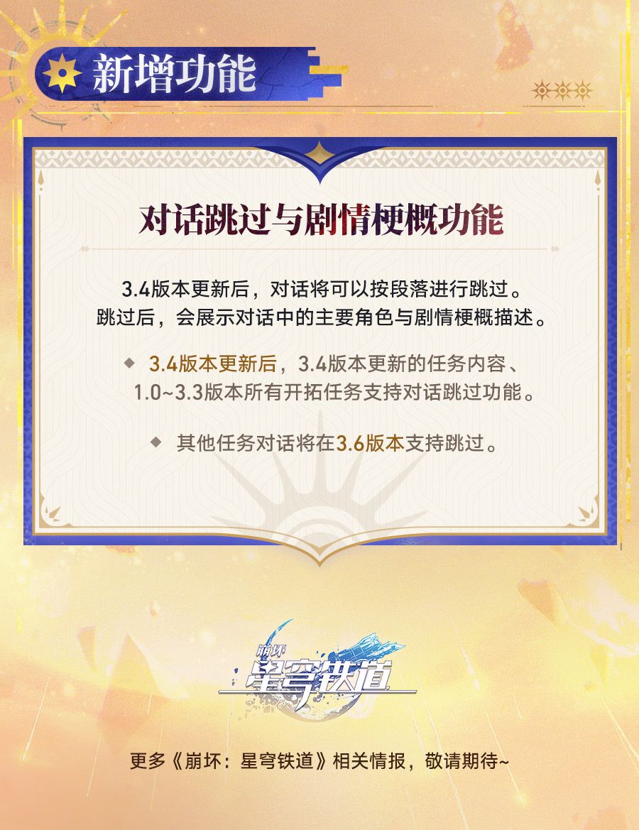 《崩坏:星穹铁道》3.4版本「因为太阳将要毁伤」前瞻特别节目现已结束,全新角色、全新场景、全新活动即将上线,欢迎各位届时登陆星穹列车,开启新的冒险旅途!