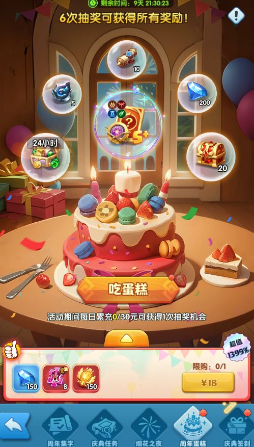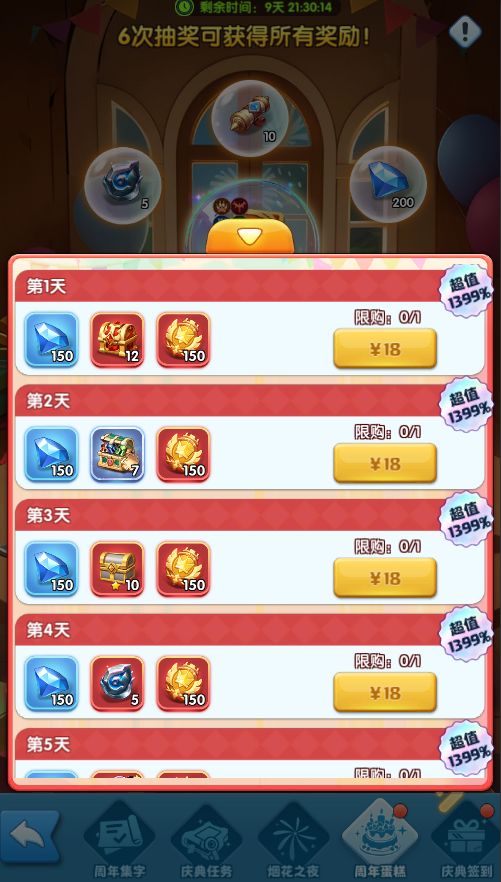 6.周年蛋糕:活动期间,每日充值满30元可抽奖1次,共计6次抽奖可获得所有奖励
