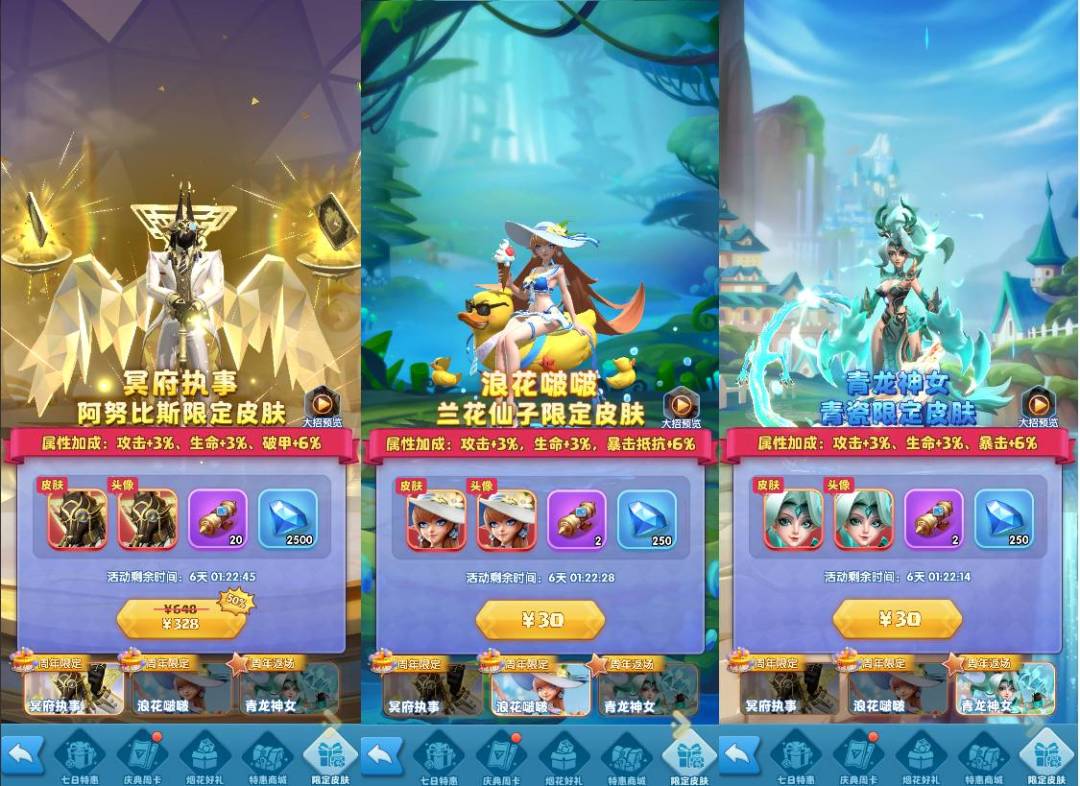 15.限定皮肤:活动期间,出售周年限定皮肤【阿努比斯-冥府执事】、【兰花仙子-浪花啵啵】,返场周年皮肤【烟雨游龙-青龙神女】。