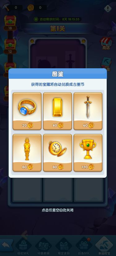7.幸运挖宝:活动期间翻开格子找到所有宝物,完成挑战可到挖宝商店兑换大量奖励