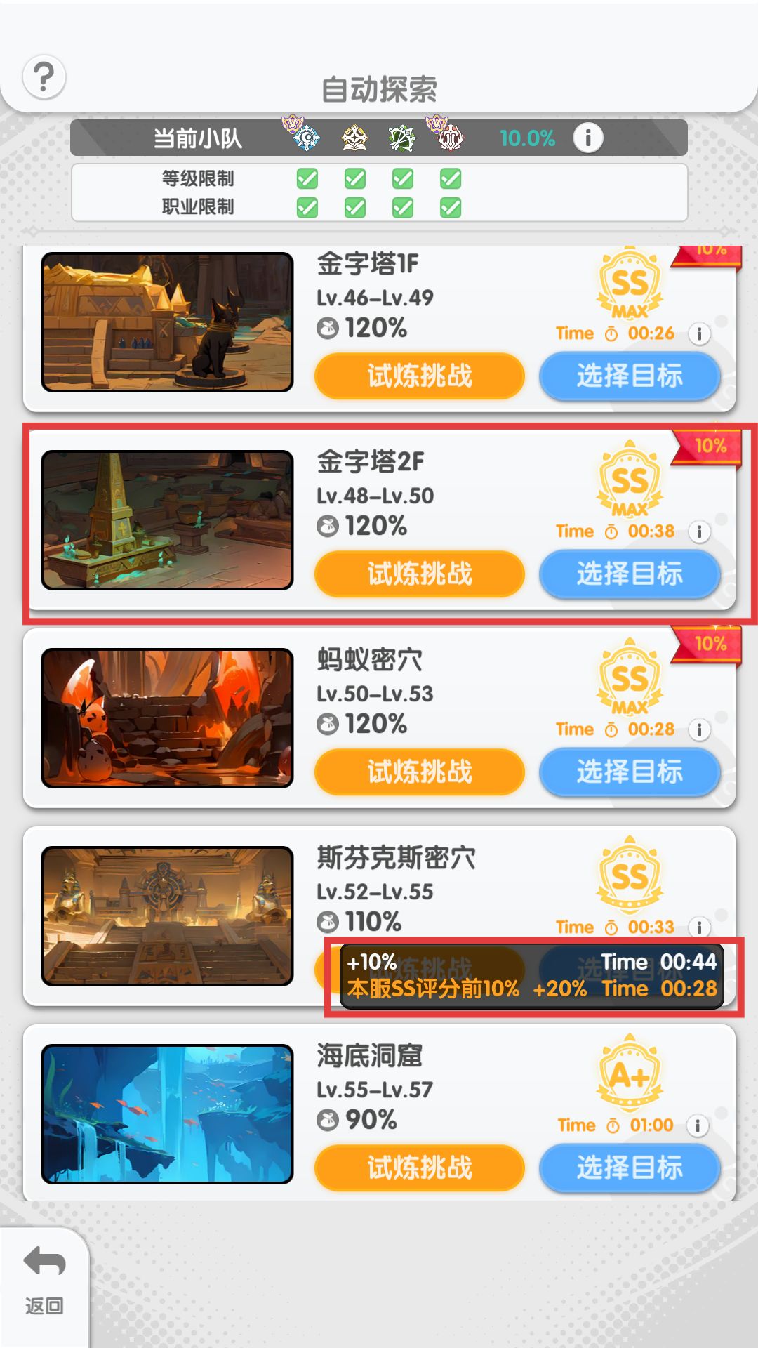 以SS通关后,会获得110%的经验加成,但当你地图通关时间在自身职业的通关者里排名前10%,则会有额外10%的经验加成。