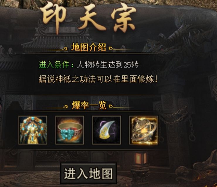 玩家需要达到25转才能进入印天宗地图。这一高门槛确保了只有实力强劲的玩家才能踏入这片神秘之地。