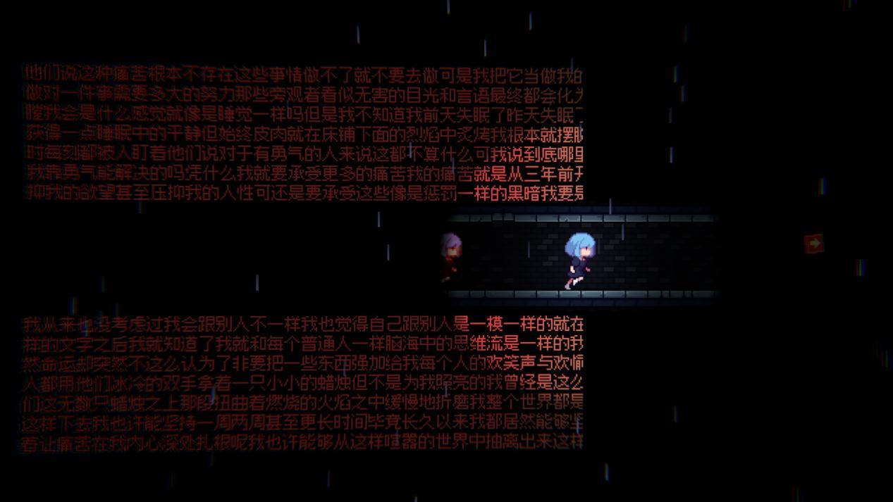 蓝发少女在闯关路上一路碰见各种引经据典,一路上自己对于过去,过去对于自己的看法、反思,带着所有的悲伤,痛苦闯入内心深处的自我,逐渐展开自己的心扉。