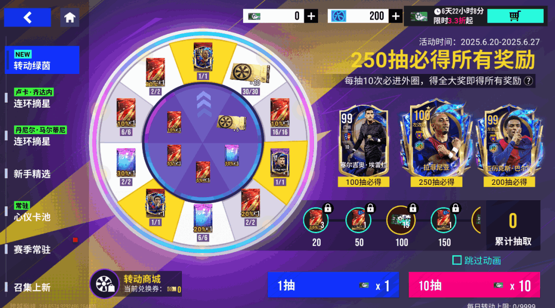 6月20日11时-6月27日11时期间,每日签到即可领取96精选球员包和「转盘抽奖券(限时)」等奖励。
