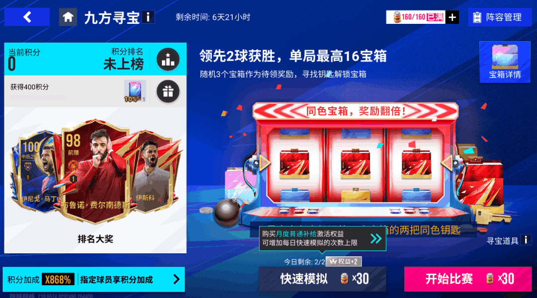 【九方寻宝】6月20日11时至6月27日震撼开启!比赛中快速领先2球就可以获得胜利,并获得一次寻宝机会;同时,比赛中还有随机任务,完成会获得额外奖励。不同的宝箱有对应的积分,尝试获得更多积分,冲击排行榜大奖吧!
