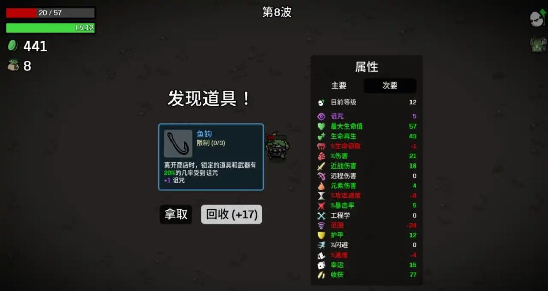 然后就是第一个精英波次可以看到我为了应对boss加了不少生存属性,对公牛来说杀掉第一个精英没那么关键,想稳过最好把闪避拉到30左右,移速加到10并且多拉生命再生(肉干其实没啥用,不指望爆果子回血)