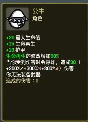 为了确保攻略的实用性,我刻意避免拿鱼钩等超模道具以及对该角色起质变作用的道具。总之先讲解一下角色的特性。没有武器意味着他不吃攻速,范围,生命汲取这种伤害特性。天生自带的高护甲和生命再生buff也决定了他偏“防守”的路线。所有伤害都会提高它的爆炸伤害,由于提升近战伤害的性价比最高,我们需要在尽可能拉高近战伤害的同时适当提升其他伤害,起码别让他们是负的。顺带一提爆炸吃暴击,暴击倍数1.5倍。所以我不是很建议点暴击。