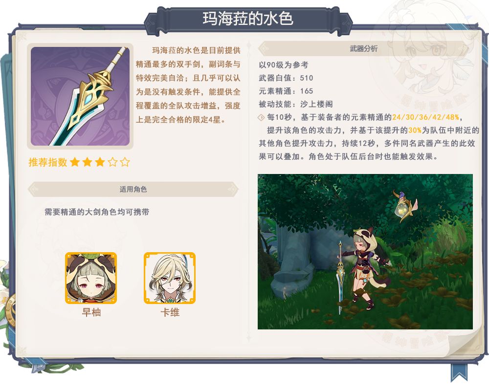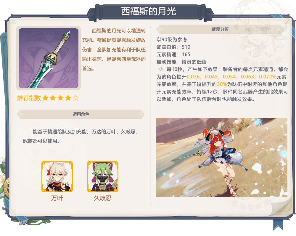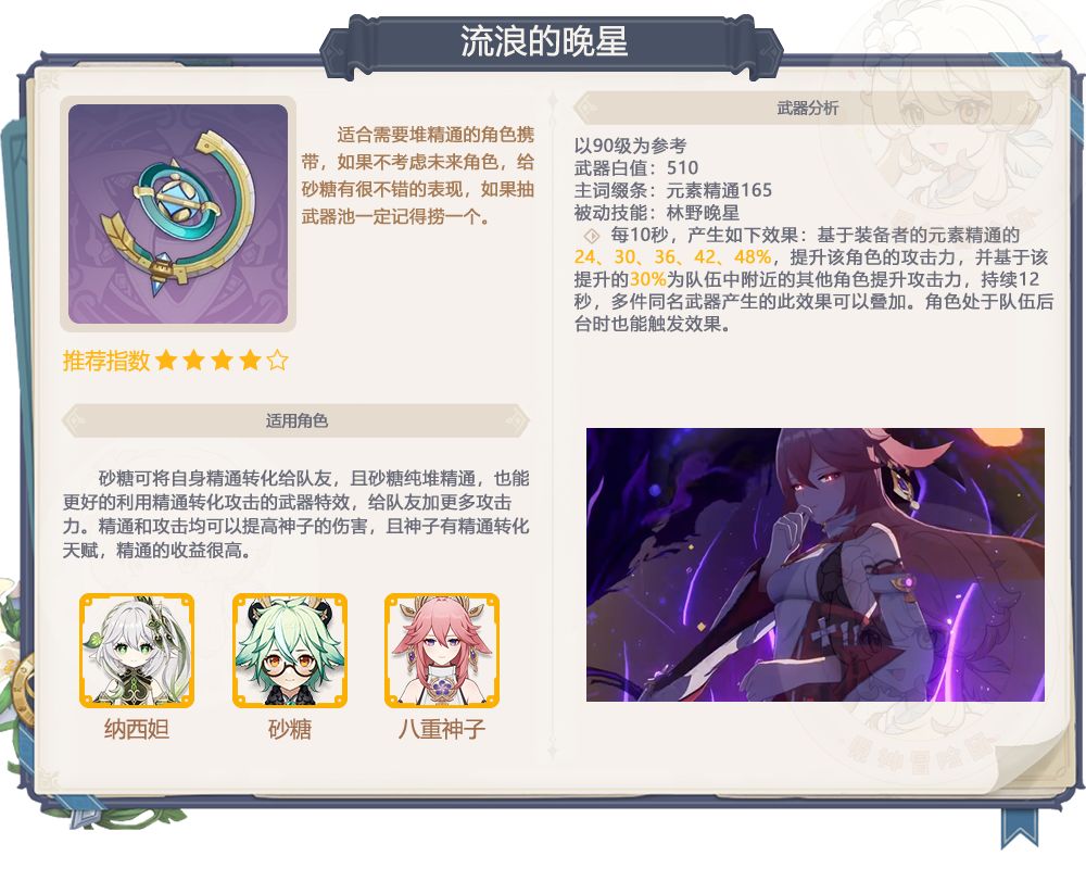 能根据装备者的精通给全队提供攻击力加成,而且可叠加,是不错的辅助四星武器,但还是因为适用角色的出场率在降低,所以不推荐特意抽取