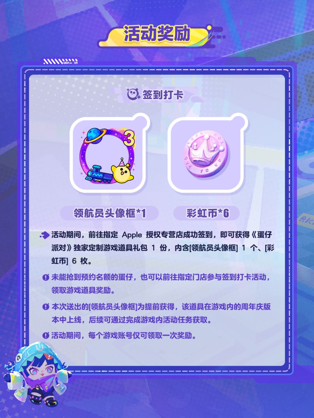 完成预约签到和试玩后,还可额外获得游戏好礼<领航员头像框>*1、<彩虹币>*6,实物周边“蛋仔六小只便签夹”*随机1款。蛋仔们快戳长图了解活动信息,并预约报名吧!