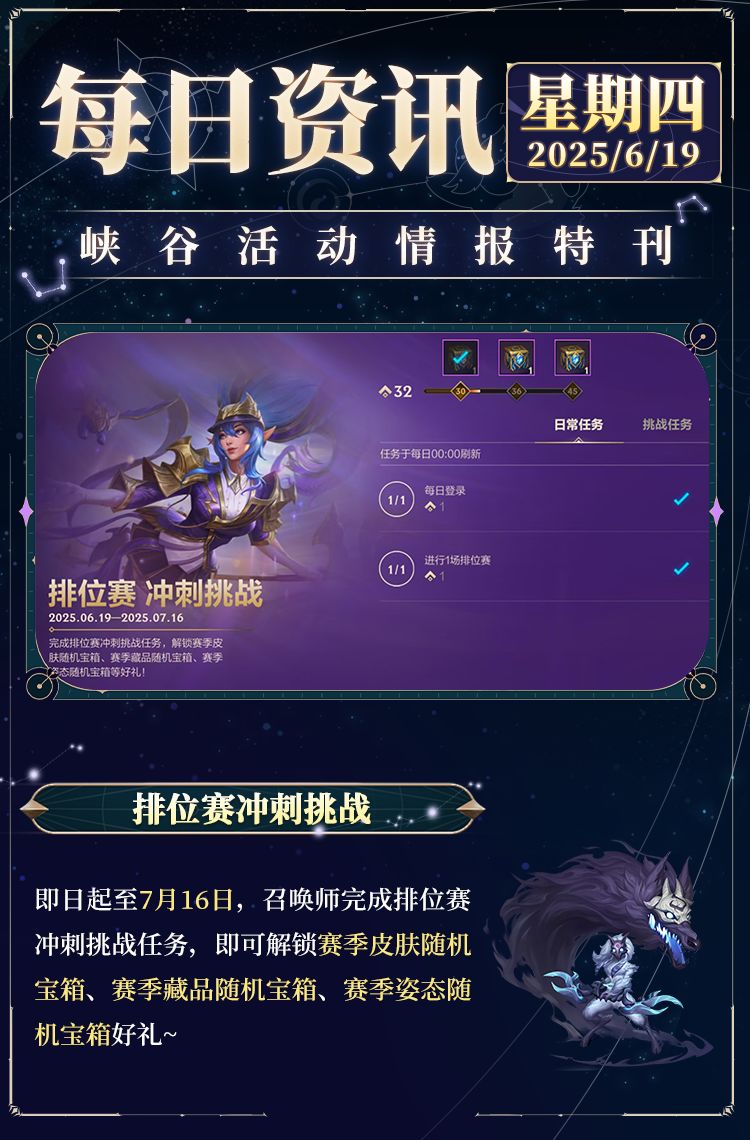 即日起至7月16日,召唤师完成排位赛冲刺挑战任务,即可解锁赛季皮肤随机宝箱、赛季藏品随机宝箱、赛季姿态随机宝箱好礼~