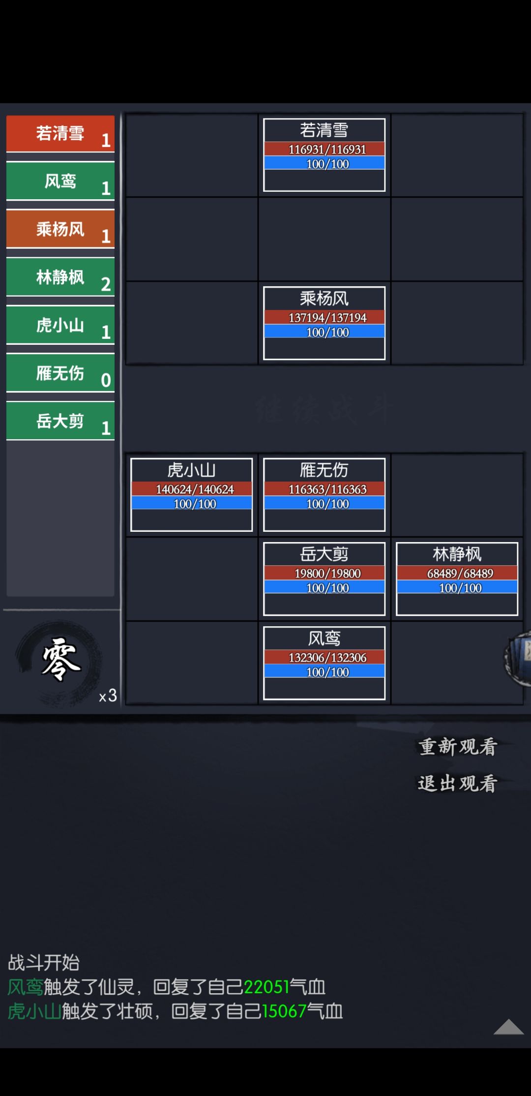 回到战斗,开始的时候发现虎小山已经死了(主要是第一回合帮雁无伤吸收伤害,我的暴免武免太低了,根本扛不住两回合),第一个若清风行动后: