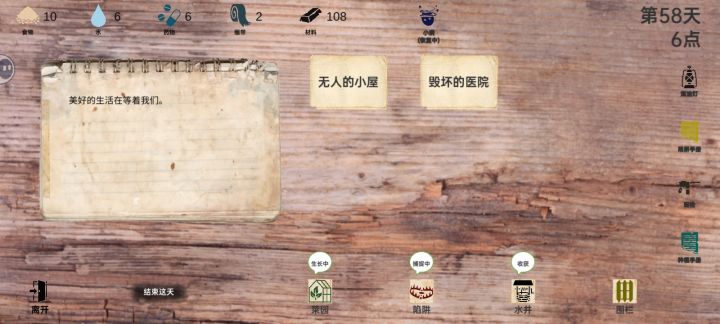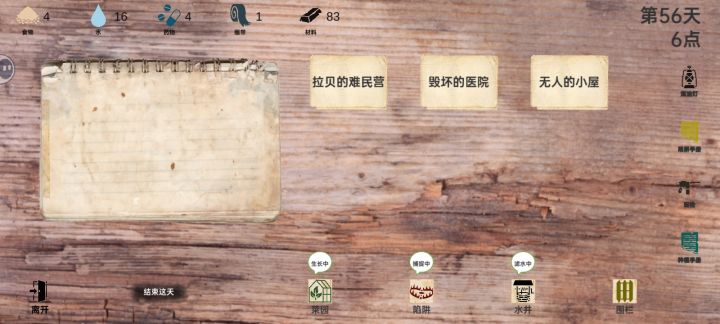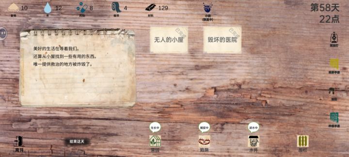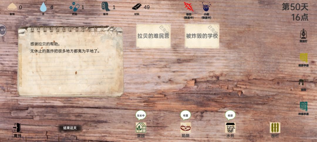 前期屯物资,12日直接开栅栏,有人受伤全部拉家里后面有码头直接刷码头,没码头刷无人小屋,材料不够就刷破旧小屋8小时的,刷新好的食物和水不要点等粮食和水不够再点,不然日本兵老是来抢,等刷出枪就可以无限屯物资了。