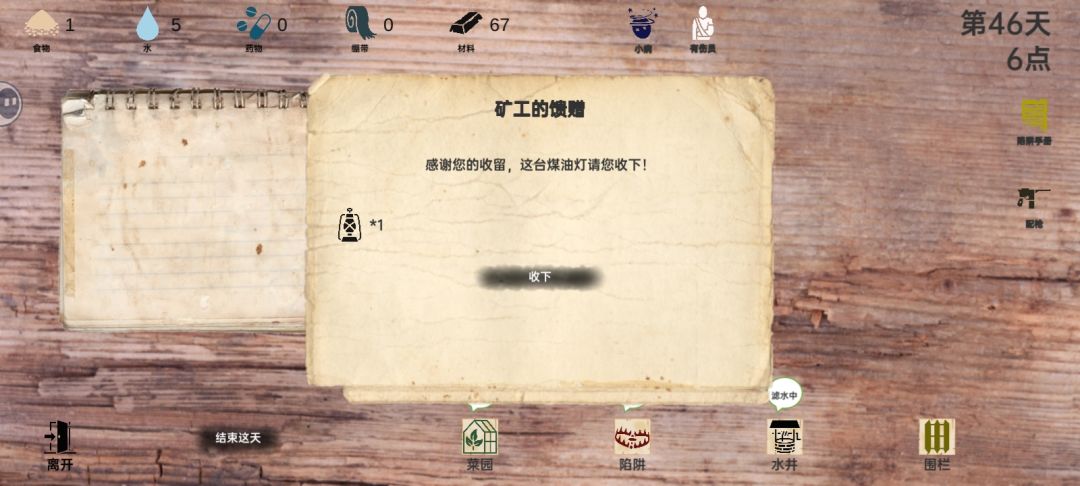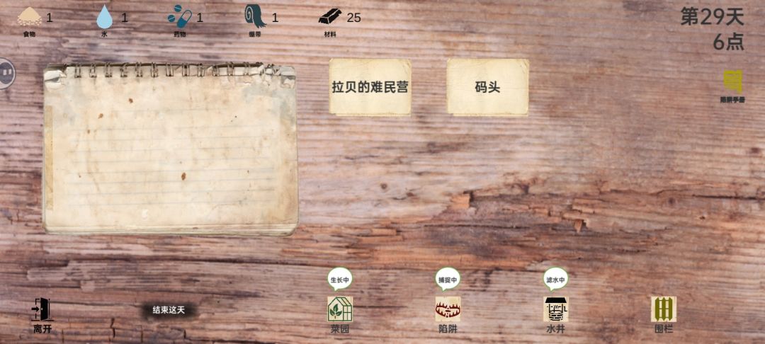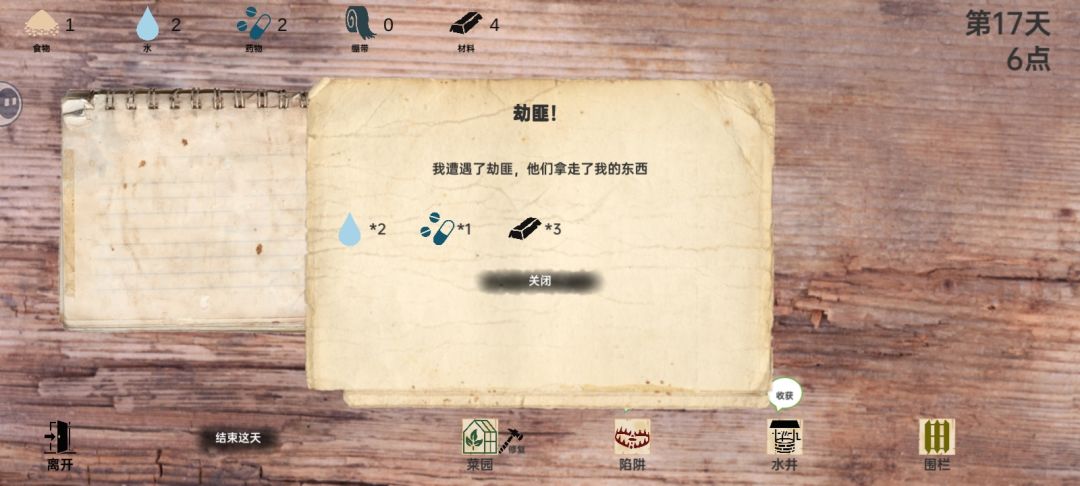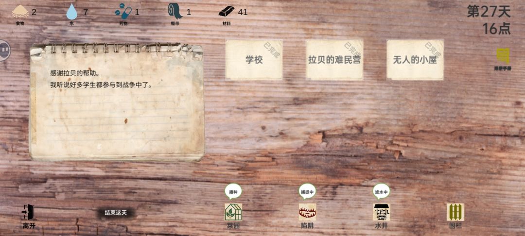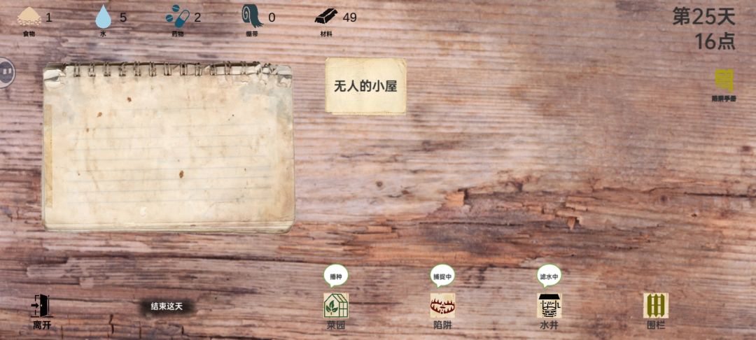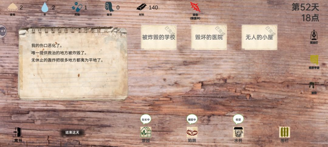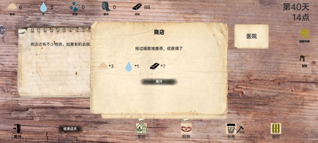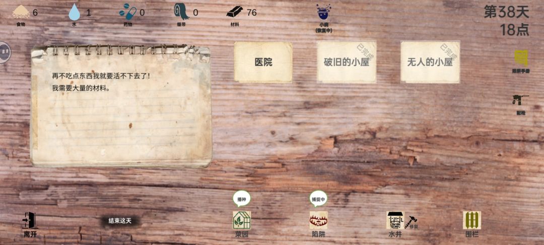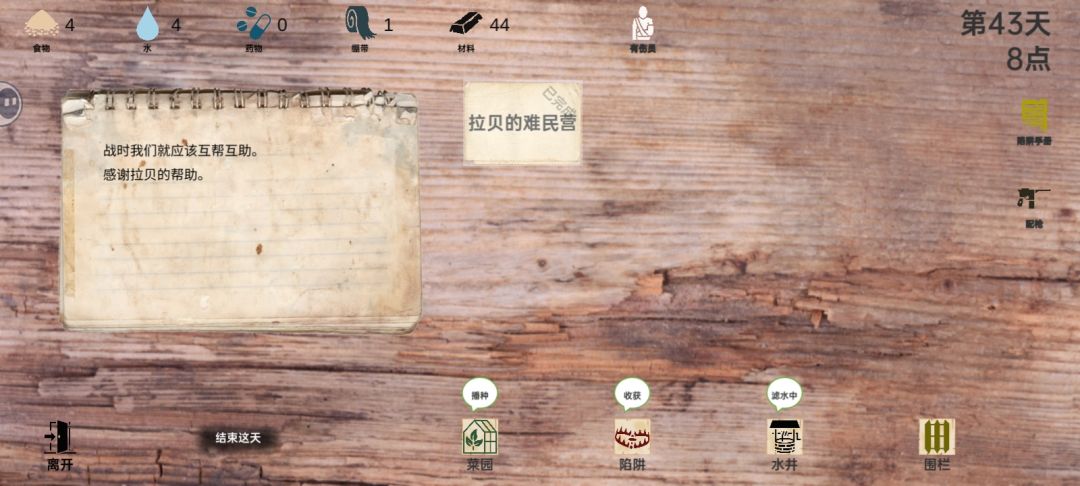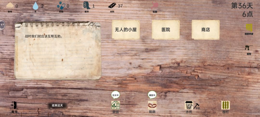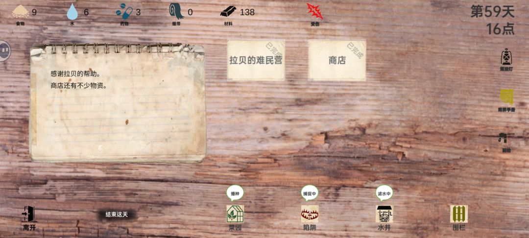 前面11天多屯物资,12天开栅栏,13天有劫匪了,选项栏里刷三个物资选择就刷物资,如果三个选项有商店就开水井,水井必须先开,然后继续刷材料,中途有伤员就把伤员拉家里,然后依次把陷阱,菜园点亮,屯药品,直到有枪就开始8小时爆刷商店,直到游戏59天结束。
