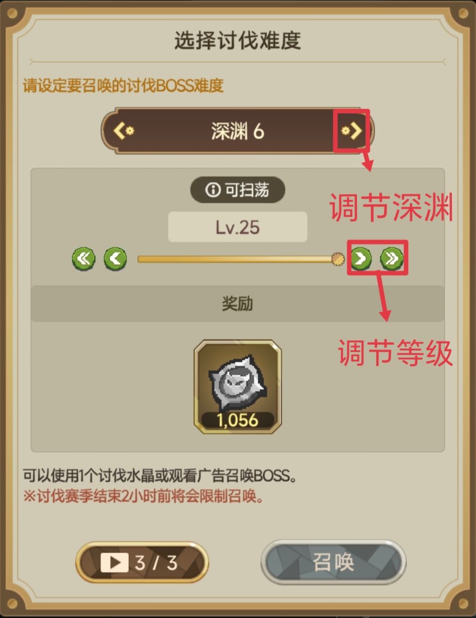 一开始打深渊可能会发现自己好像只能召唤1级的,因为必须要等深渊1Lv1三条命都被打完才能召唤下一级,而你自己只能打两次,所以必须要等别人帮你打完,才能召唤下一级