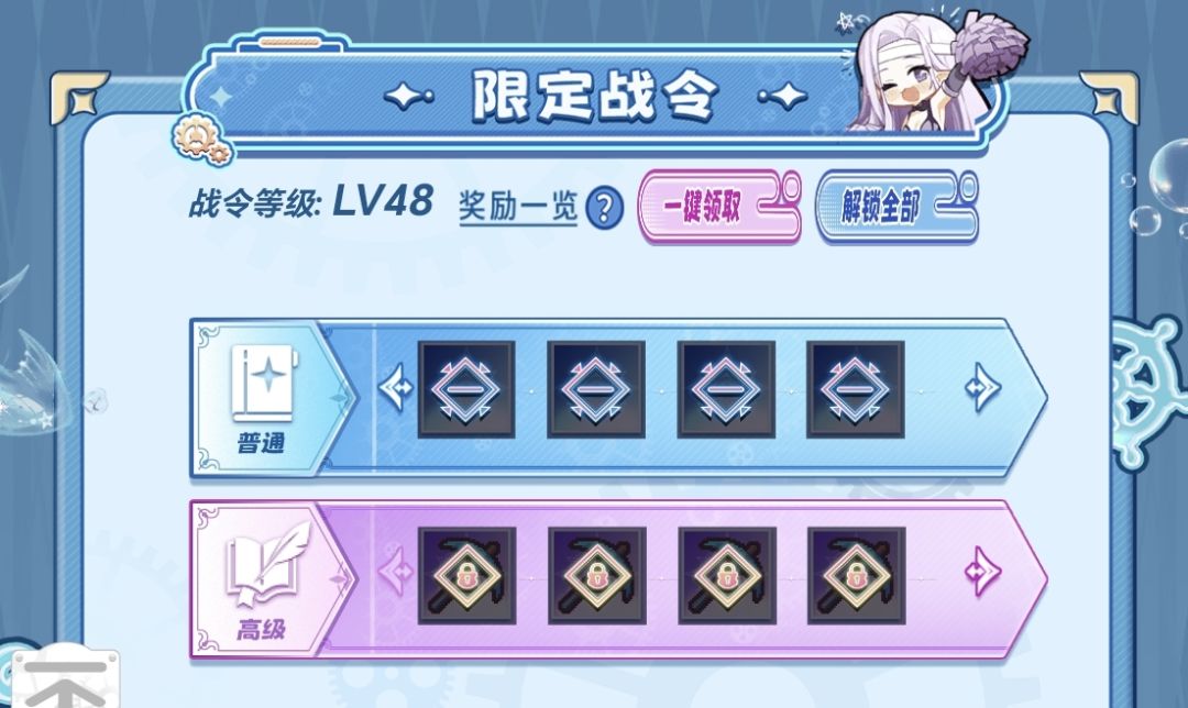 其中普通战令奖励数量有限,不要点一键领取,因为一旦全部领完,就无法完成每日任务了,所以建议一天只领一个