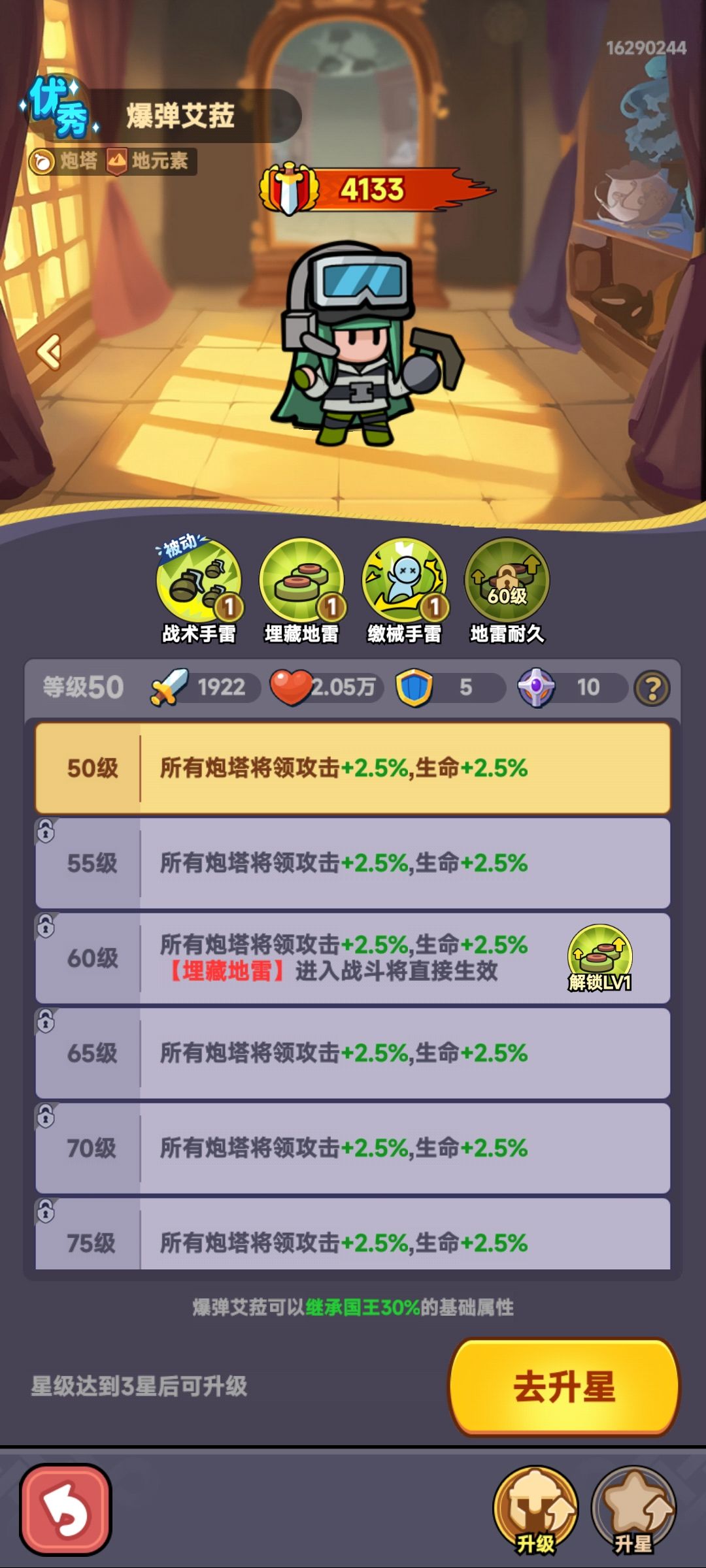 最后是第四个炮塔,炮塔只有局内建筑选择建造炮塔,这个英雄才会出现,所以炮塔英雄的需求强度在副本闯关中,其实是不高的,一般等级最高的那个由他来上阵即可,不过作为新手推荐搭配而言,我更倾向于推荐艾菈,因为艾菈是技能都是范围伤害,伤害在炮塔英雄之中,技能面板伤害是最高的,最关键的是艾菈技能带有缴械效果,能让目标无法攻击。#游戏攻略