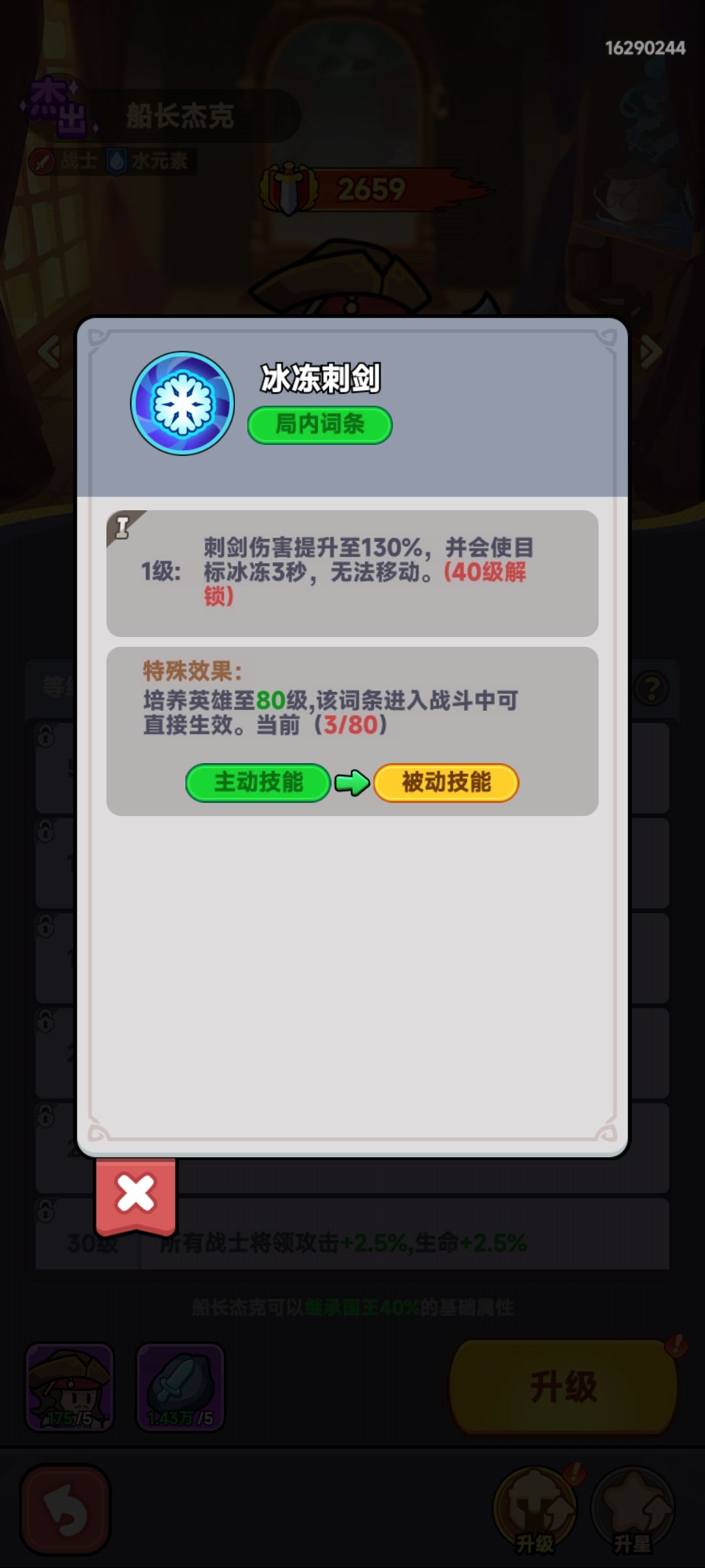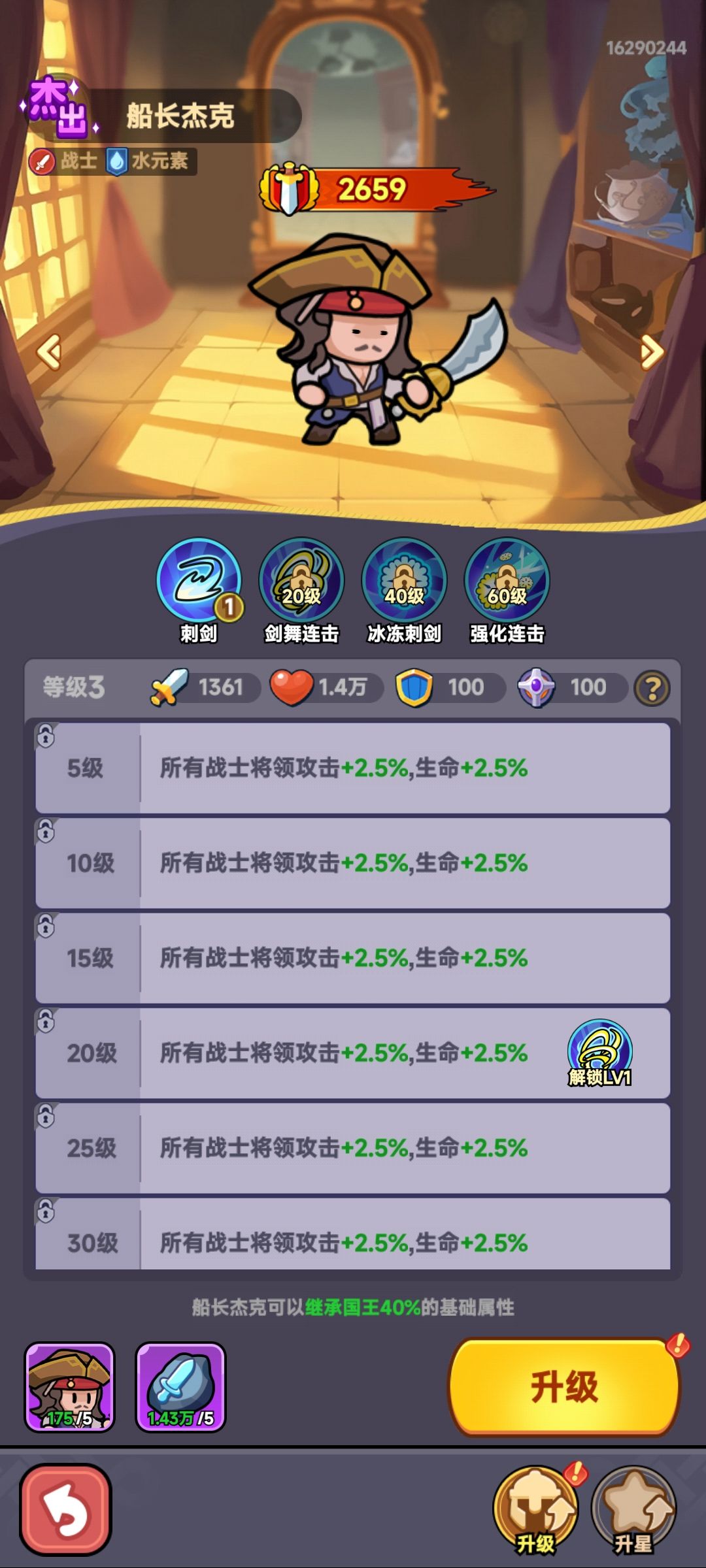 船长杰克,15关之后需要的英雄,船长的一二技能强度不高,第三个技能能让一技能觉醒,并且打出冰冻效果,让目标无法移动3秒,打BOSS有优势且关键,走点位能耗死,属杰出中品。