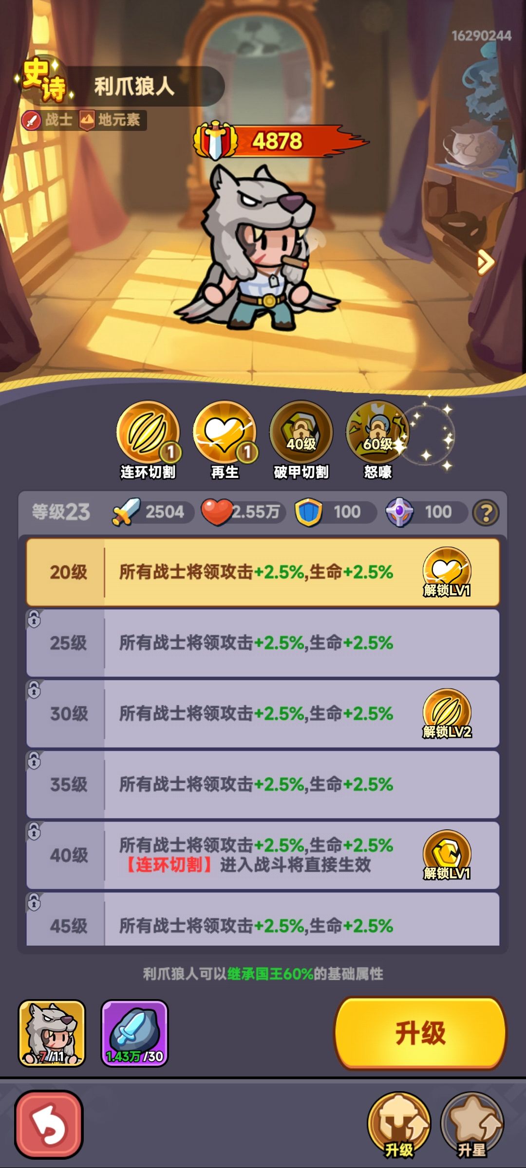 利爪狼人较难获得,一技能造成多段范围伤害,二技能有再生效果,回复最大生命值百分之12,等级高了能抗能打,但抗伤比起凯伦要差许多,狼人主要是伤害极高,在战士职业中伤害排名第一,另外狼人一三技能联动,可以让一技能打出伤害的同时加上破甲效果,属史诗上品。