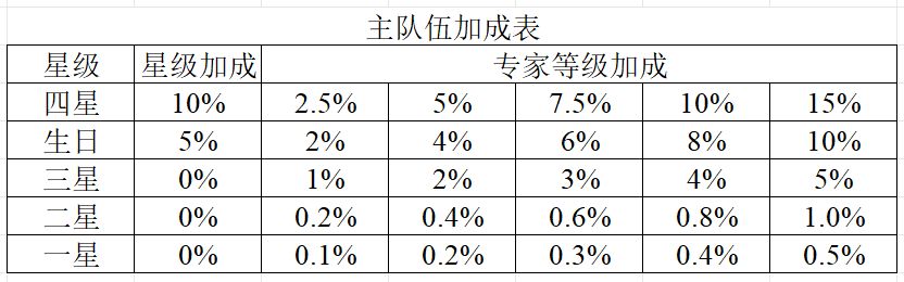 对主队伍星级和专家等级加成细分,得到下表: