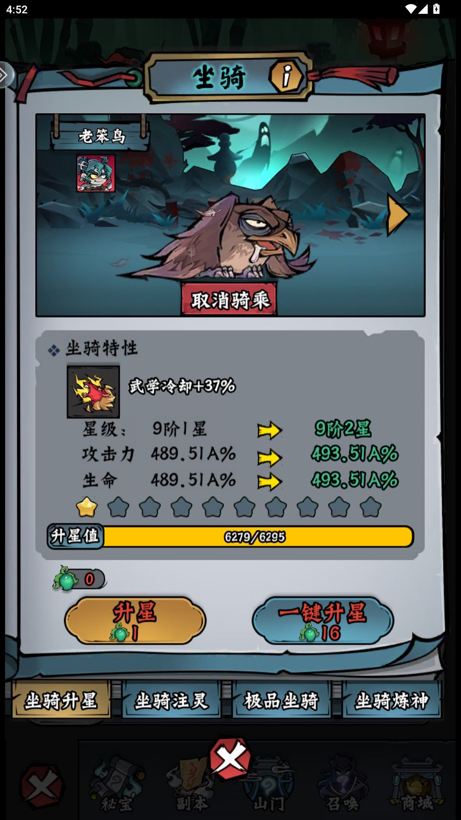 坐骑升星加的属性非常多,开放后每日代金卷买一些果子升级,雪莲不强求,雪莲越后面升级概率越低收益很小