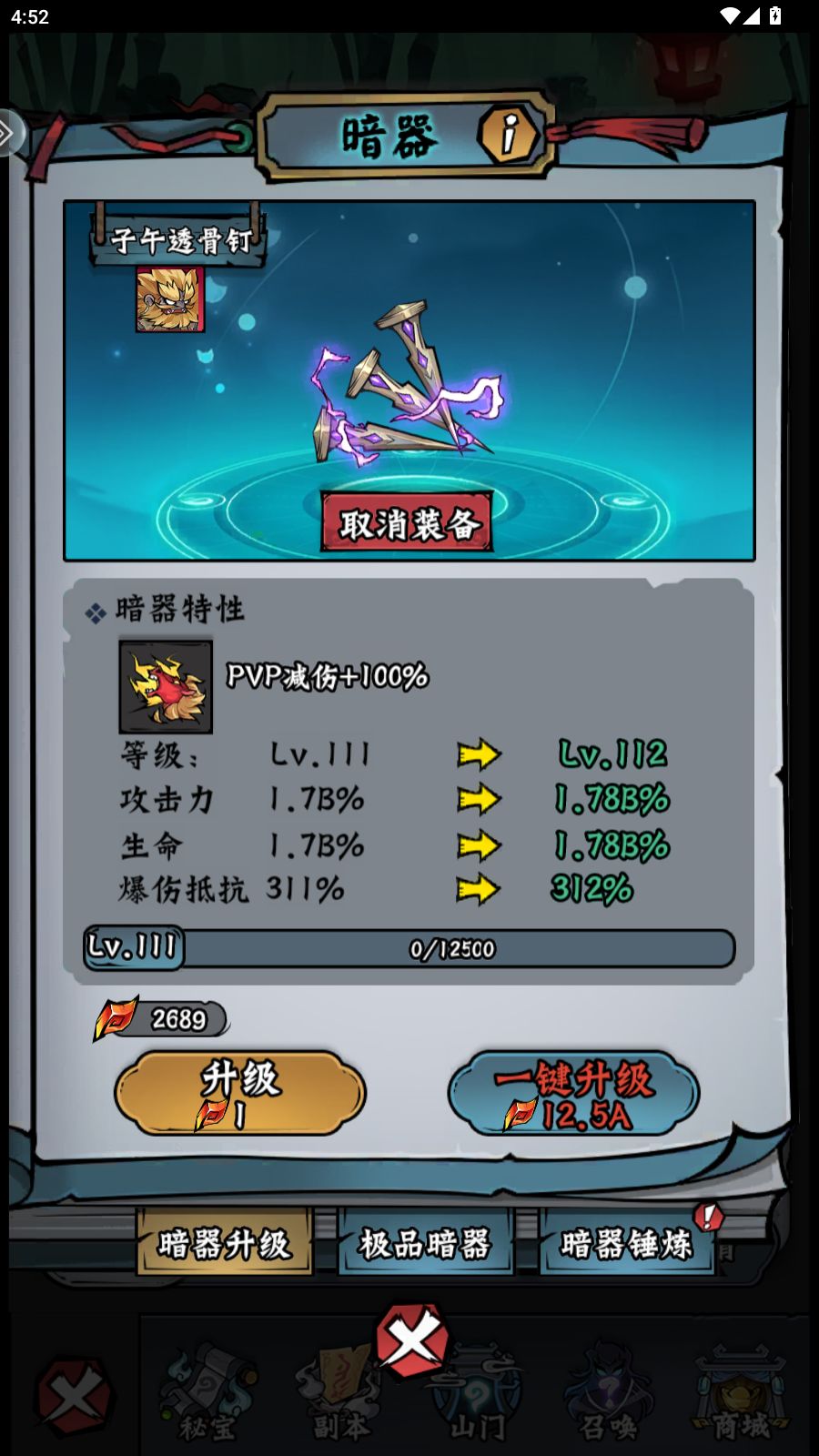 暗器升级加的属性也很多,开放后和坐骑一样,买点材料升级。