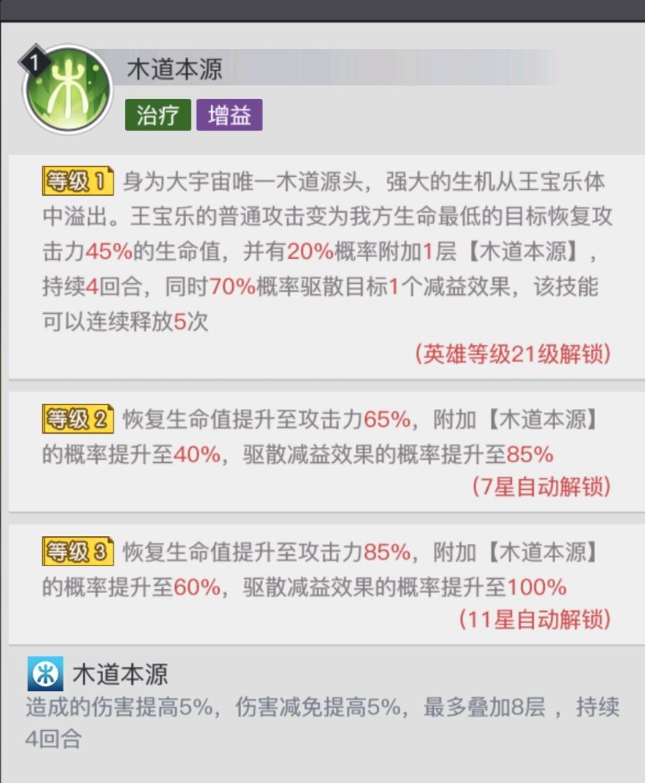 在【木道本源】满级状态下,王宝乐的普通攻击变为我方生命最低的目标恢复攻击力85%的生命值,并有60%概率附加1层【木道本源】,持续4回合,同时100%的概率驱散目标1个减益效果,该技能可以连续释放5次。