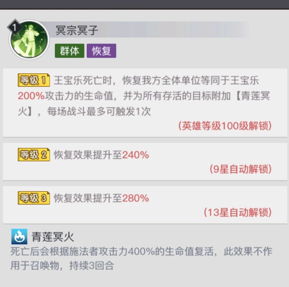 技能满级状态下,王宝乐死亡时,恢复我方全体单位等同于王宝乐280%攻击力的生命值,并为所有存活的目标附加【青莲冥火】,每场战斗最多可触发1次。