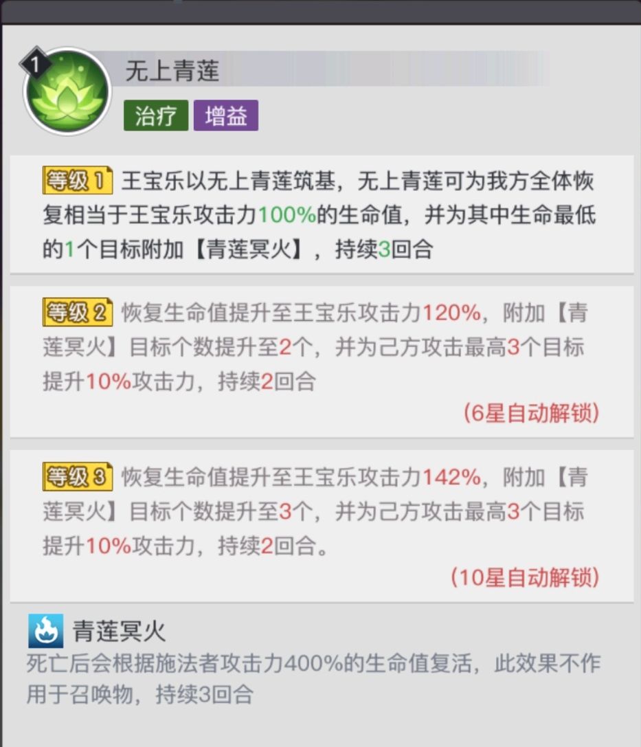 技能满级状态下,王宝乐为我方全体恢复相当于王宝乐攻击力142%的生命值,为其中生命最低的3个目标附加【青莲冥火】,持续3回合,并为已方攻击最高3个目标提升10%攻击力,持续2回合。