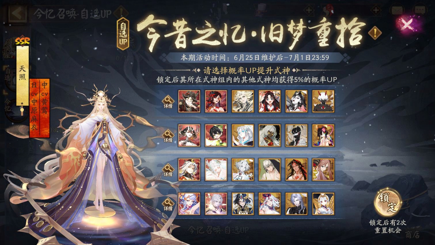 ※活动期间,可使用「昔梦符咒」进行召唤。阴阳师大人可选择喜欢的式神分组作为概率UP式神组,并指定其中一位式神获得额外的概率UP增长。