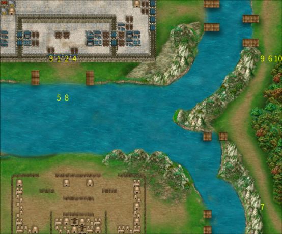 3、第三回合孟达带弓兵*8+枪兵*4在西边出现,徐晃带海贼*12在河东边出现。