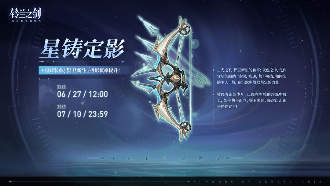 「星铸定影」限时投影将于 2025/06/27 12:00 - 2025/07/10 23:59 开启,全新星铸装备「誓卫新生」投影获取概率将大幅提升!