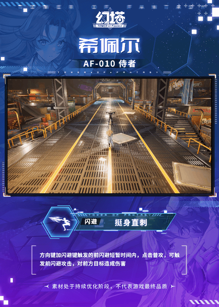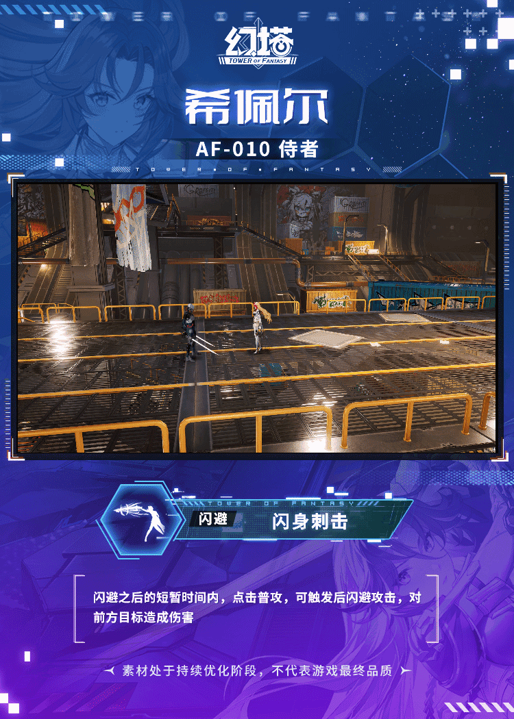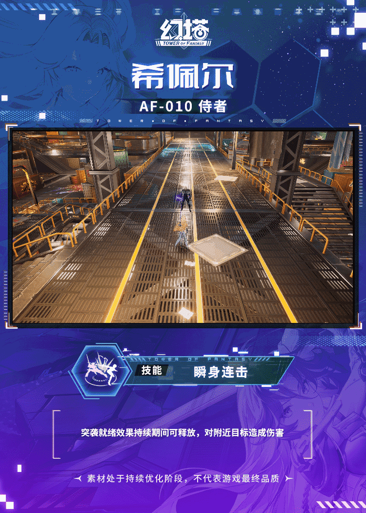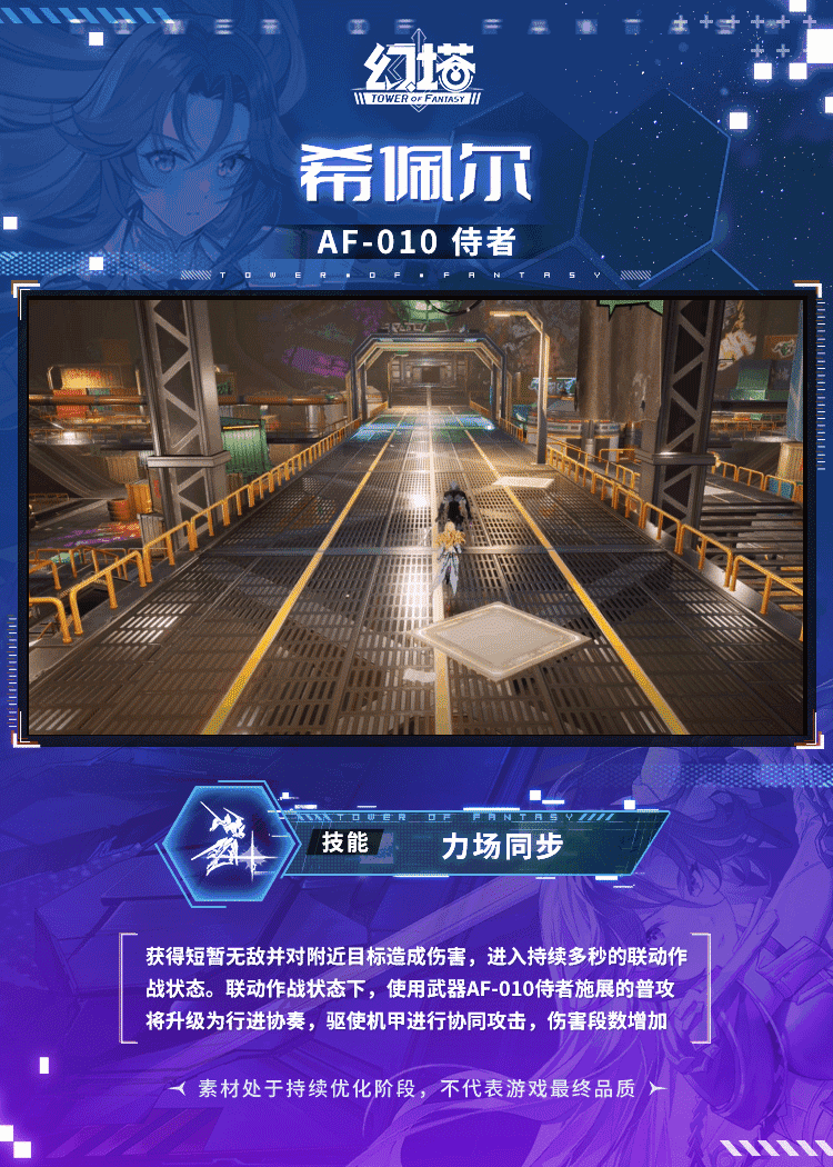 获得短暂无敌并对附近目标造成伤害,进入持续多秒的联动作战状态。联动作战状态下,使用武器AF-010侍者施展的普攻将升级为行进协奏,驱使机甲进行协同攻击,伤害段数增加;一段时间后,获得突袭就绪效果,升级技能为瞬身连击,并解锁分支-交错轮舞