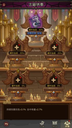 3.部分圣座上供奉古籍的高级属性还会受到额外增幅。圣座越位于下方,则对高级词条的额外加成越少,因此,可以选择将最强力的秘典或古籍放在1号。