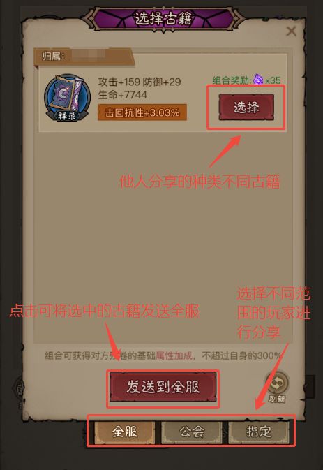 3.需要寻找其他人的残破古籍完成拼合,拼合可直接与世界上书籍拼合,也可发送到世界、公会、指定玩家。