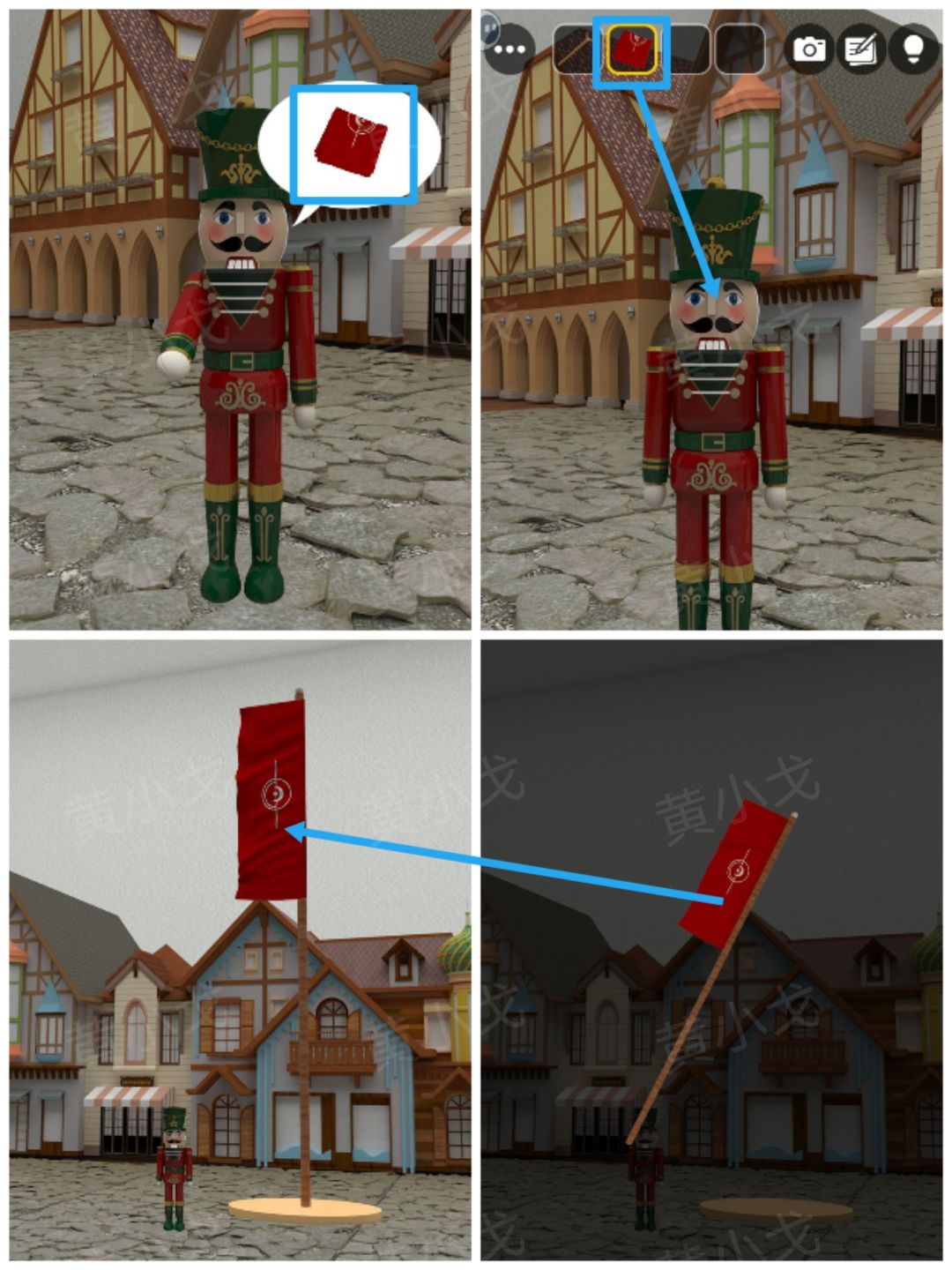 21.根据旗子上的符号提示,结合[洞口]场景墙上的符号及位置线索,调整旗子的位置;拾取精灵手上的【扳手】