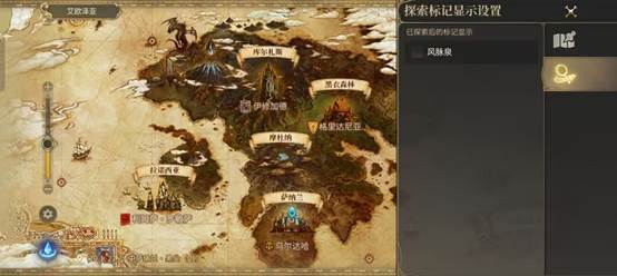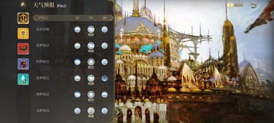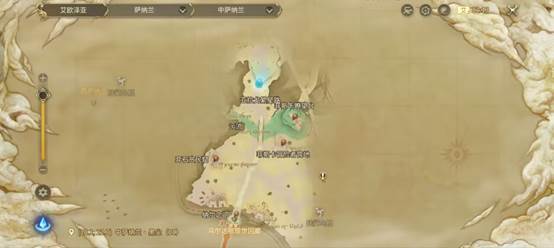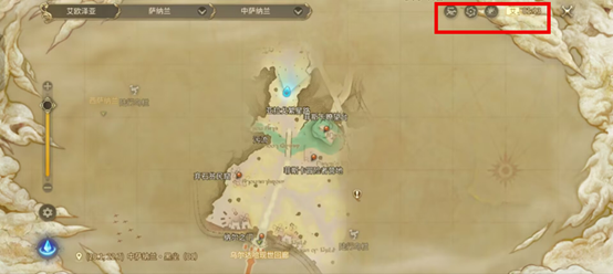 地图界面的右上角标注了艾欧泽亚时间,从左到右的三个按钮分别是坐骑速度、风脉、天气预报。