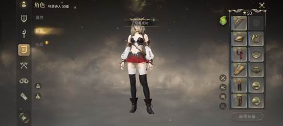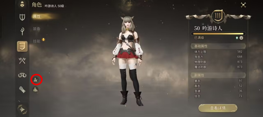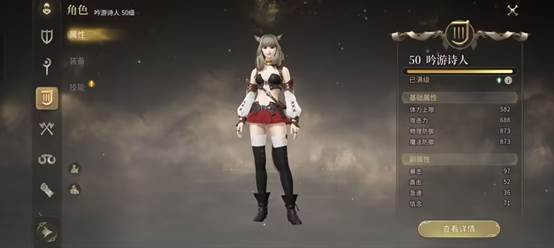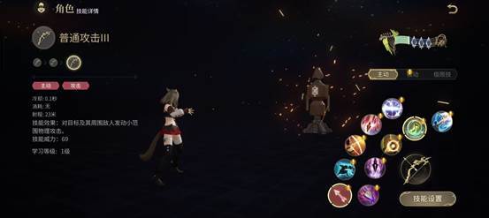 点击第三个人物图标后则进入了角色面板,可以看到当前角色的职业、等级、属性,并对装备进行调整,也可以进入技能界面了解技能解说。
