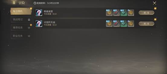 第二个图标则是冒险功能,可以在这里完成每日随机、挑战笔记、职业任务等。