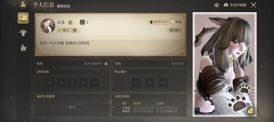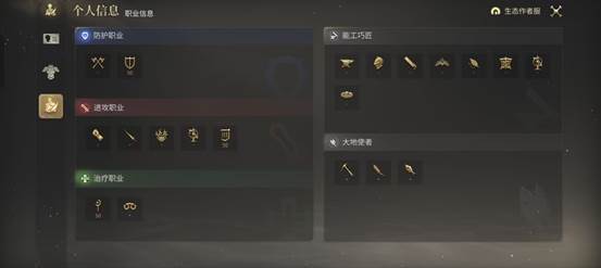 点击左侧的小人图标,进入个人信息界面。在该界面可以看到冒险者铭牌、装备信息、职业信息。